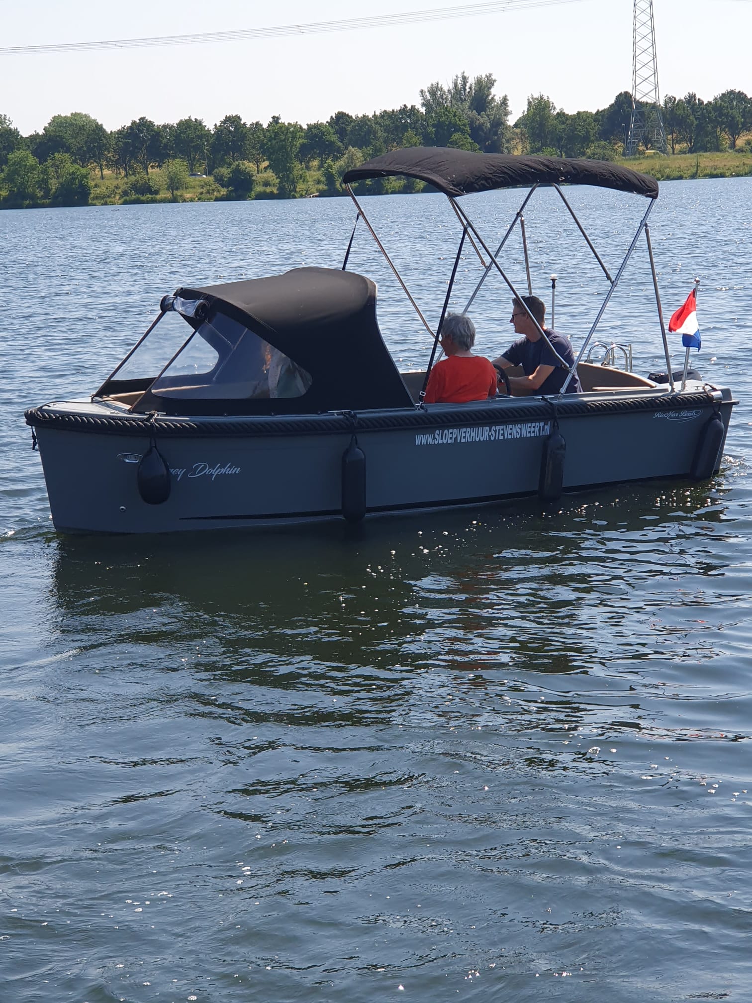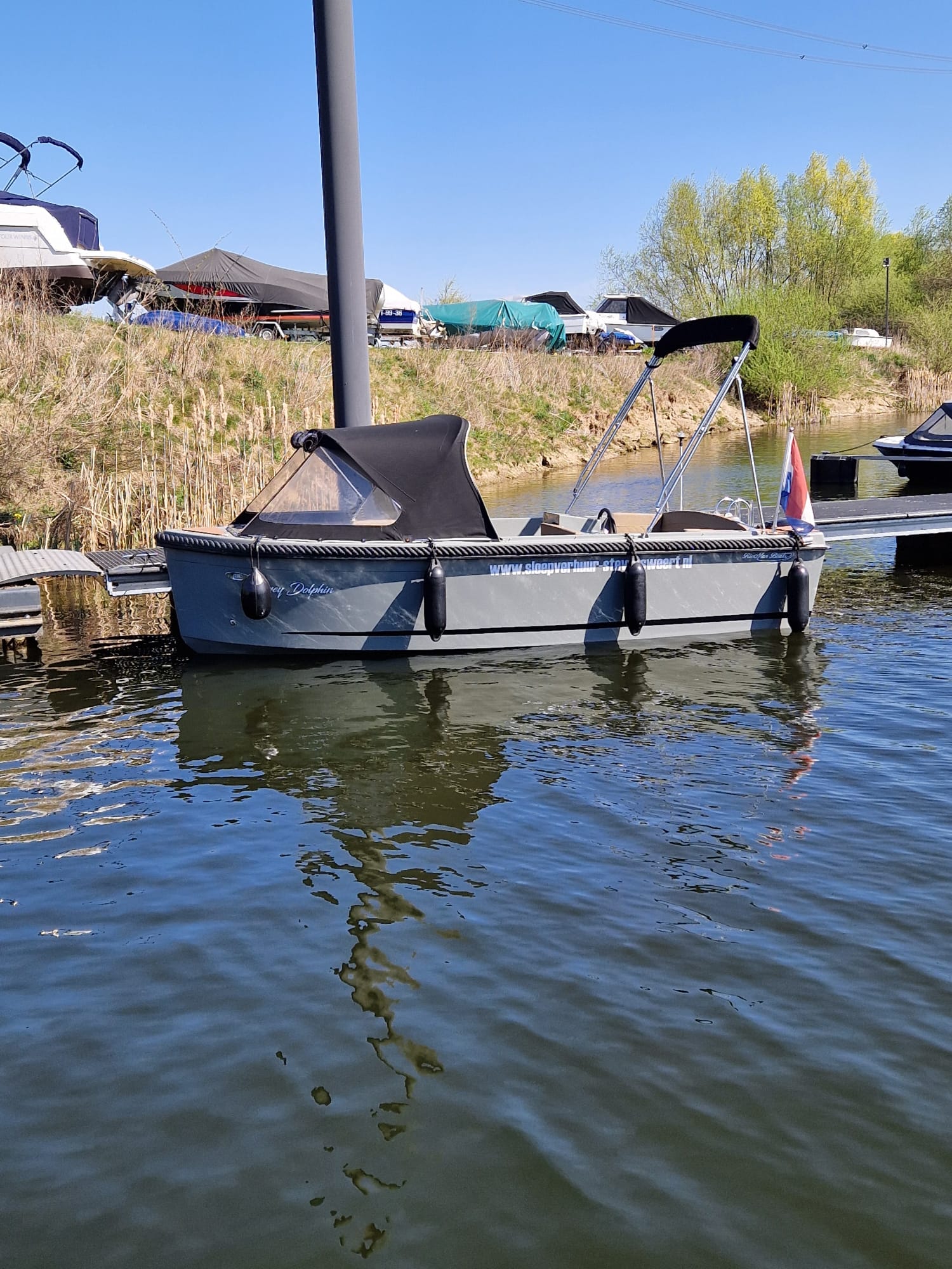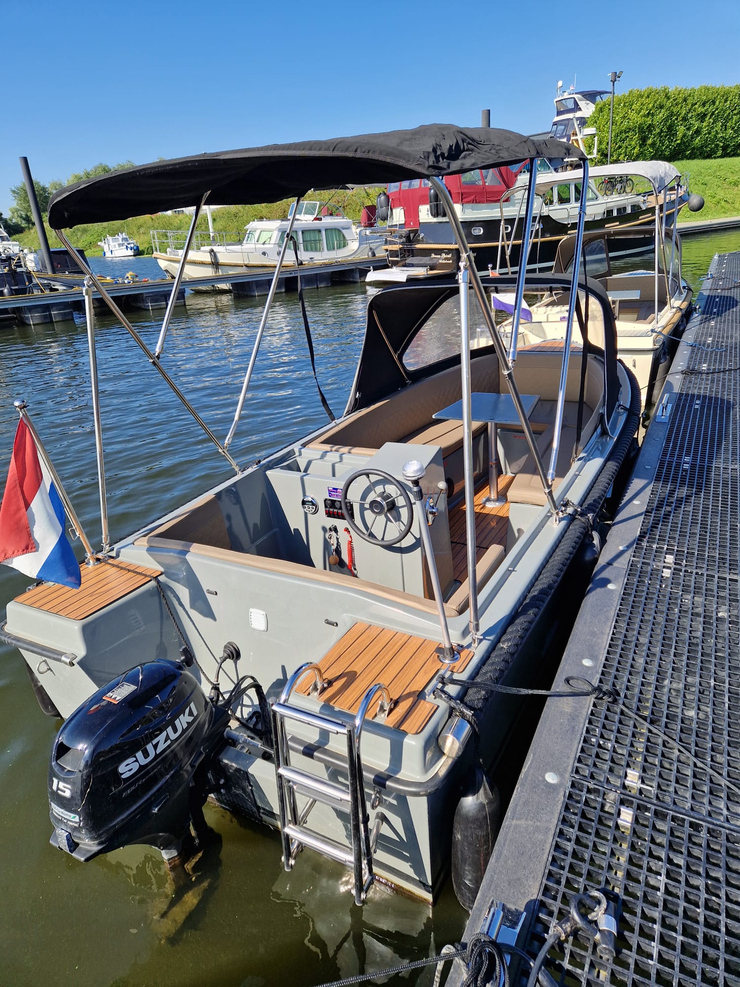 RioMar 490 met 15 pk motor, in twee delen neerklapbare kap, voorzien van zitbanken rondom, tafel, radio, biminitop, zwemtrap