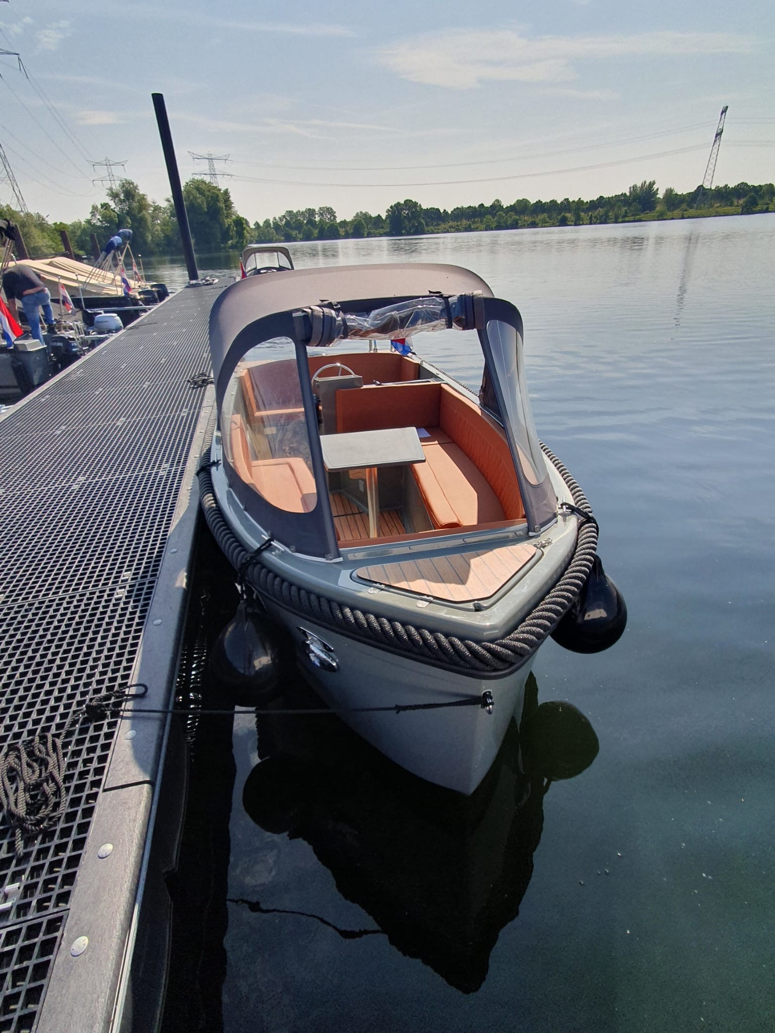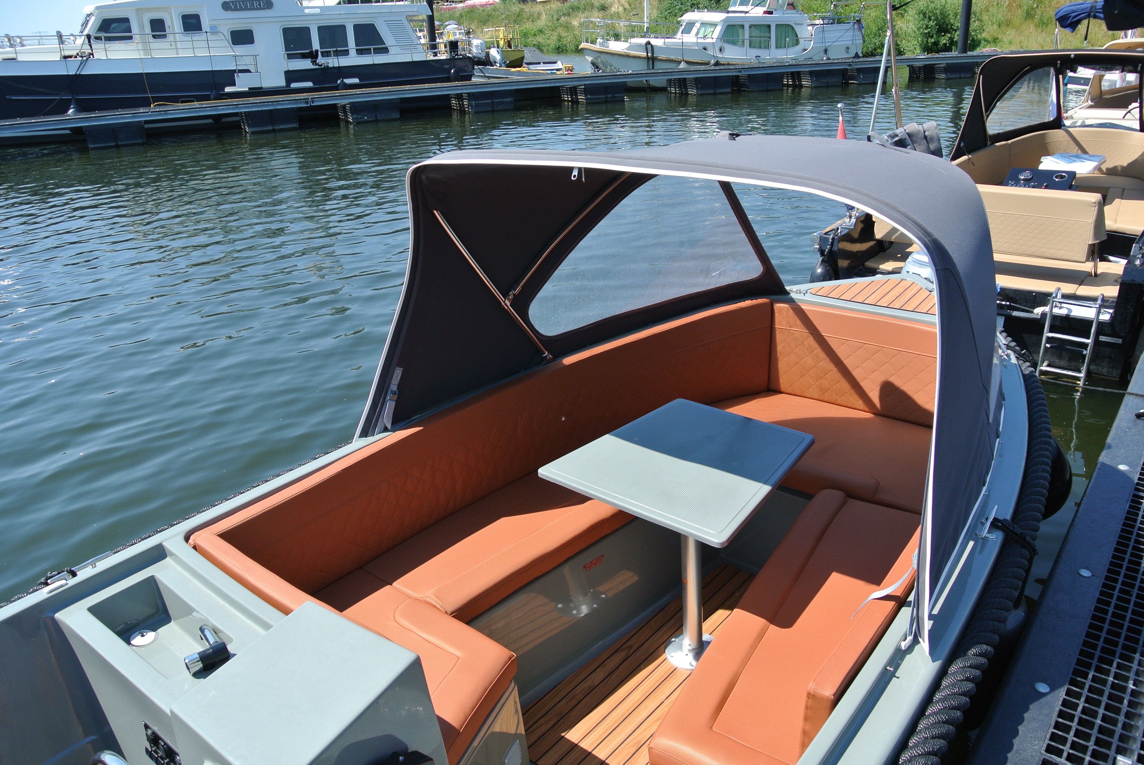 RioMar 49​0 met 15 pk motor, in drie delen neerklapbare kap, voorzien van zitbanken rondom, tafel, radio, biminitop, zwemtrap